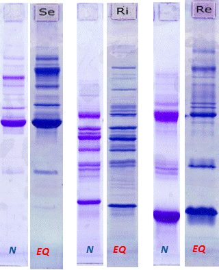 SDSGels are Ready-To-Use gels for SDS with a thickness of 0,5 mm and a separation distance of 110 mm. Method: SDS These gels are polymerized on support films: Polyester for Coomassie and Silver stain, also for fluorescence in the red channel or NF-film support for fluorescence on all channels; see below SDSGels short are Ready-To-Use gels for SDS with a thickness of 0,5 mm and a separation distance of 85 mm. Methods: SDS EQ-type: A new matrix was developed! For best resolution and silver staining behavior. Comparable to the discontinued ExCelGels and to all self-casted SDS-gels! Gel Electrodes: are now supplied with all ElphoGels SDS, non toxic! Best resolution and super sensitive silver-staining. All film-supported gels can be scanned directly without any glass cassette! Increased sensitivity! Stacking gel (5%T) and resolving gel (12.5%T). PET support film: For Coomassie- and silverstain. The fluorophores f.e. T-REX, Flamingo and Pro-Q are working in the red channel (exciting: 648 nm, emission: 663 nm) See the manuals and data-sheets on “Downloads”. Staining recipes: “fluorescence staining”, “phosphorylated proteins” NF support film: For fluorescence stainings in all channels (UV, blue, green and red), e.g. DIGE, FITC etc.